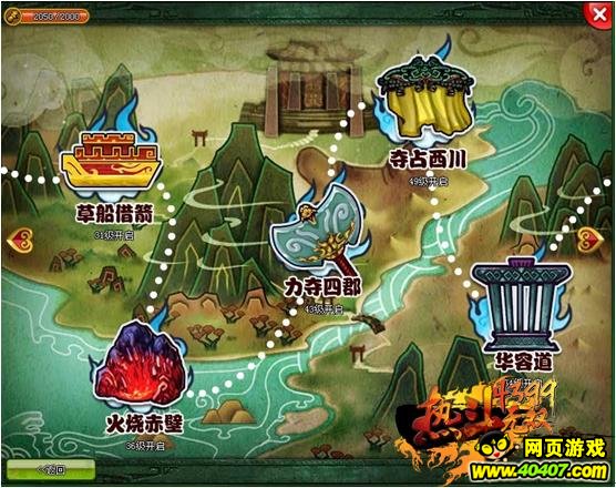 草船借箭(31级开启):周瑜妒忌诸葛亮的才干,要诸葛亮在十天内造好十万支箭,想以此陷害他。诸葛亮用妙计向曹操“借箭”,挫败了周瑜的暗算。