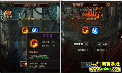 但是每次点击,强化的符文石随机的,也就是说可能是符文中的任何一个得到强化,并不是由玩家觉得强化的符文。符文升阶需要20个升阶石。随着阶级提升则需要更高级的升阶石。高级升阶石可以通过高级关卡获得,也可以通过低级升阶石合成。