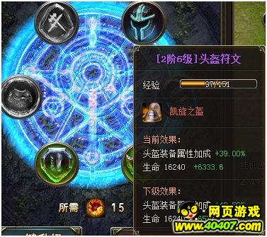 高级的符文增加的属性是很可观的,以40级头盔为例,基础属性是16240生命,头盔符文等级为2阶6级(即36级)增加了39%的属性,也就是6333生命。这相当于一颗6级宝石的加成。同理其他装备也是如此。而符文石只要通关无尽之塔就可以每天有3次扫荡机会,产出的符文石是完全免费的,第三关的产量大约是3次400个的样子。强化并不需要金币等其他道具,并不会影响其他系统的提升。因此符文系统是一个很实用很强力的系统。