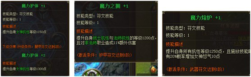 8月28日游戏更新以后,符文系统新增了符文技能,即符文达到一定等级要求之后产生的特殊技能。下边以法师为例,我们可以看到在魔法阵的上方还有三个模块分别是“魔力护体”、“魔力之拥”、“魔力熔炉”三个技能。