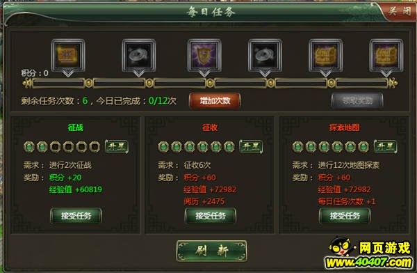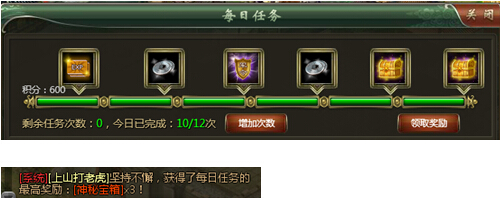每次完成每日任务都将获得对应的任务积分,积分累积到一定值时,将可获得额外的积分奖励,最高奖励为神秘宝箱、可以开出终极精神攻击装备!