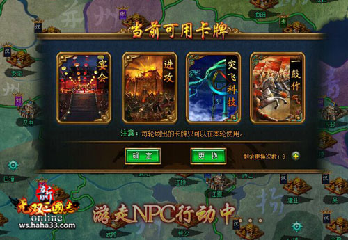 敏乐游戏《新无双三国志OL》的玩法以经典的回合制方式进行,每回合消耗政令抽取四枚卡牌,而卡牌则决定了本回合可进行的策略组合,例如“进攻”可对敌人城池发动攻击、“科研”可获得研究点数升级科技、“探索”在城池中寻找宝物等等,数十种功能各异的卡牌将成为统一路上的核心。
