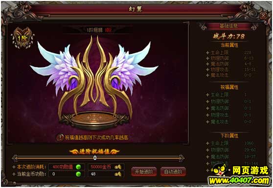 翅膀进阶需要消耗功勋值与金币,进阶成功与否与祝福值高低相关,祝福值越高,越有可能完成进阶!已经提升的祝福值会永久存在,根本不需要担心第二天祝福值会清空的问题!